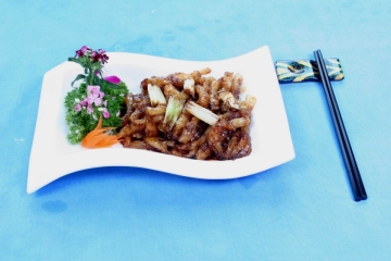 2、大葱切断,入油锅慢火炒至金黄,加入蹄筋,调味,加少许汤汁 慢火煨入味,勾芡即可