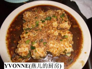 4、铁锅油少许烧热,将刚才塞丝瓜剩下的肉馅倒入煸炒出香,加老抽、黄酒、蚝油、盐、鸡精、糖、水烧稠,撒上葱花,浇在刚刚蒸好的丝瓜塞肉上。
