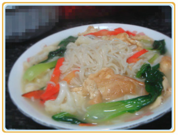 水面350g,米饭500g,青菜,肉丝,虾仁,鸡汤,精盐,绍酒