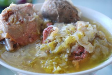 2、吃时,锅里倒上炖鸭子汤烧开,加酸菜即可。