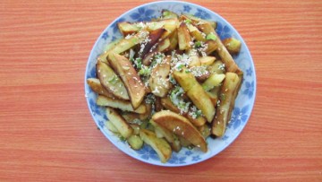 1、土豆用工具刮去表皮,洗净切成1公分见方的长条待用;2、锅坐火加植物油,油热后均匀的摆上土豆条,盖上锅盖小火慢慢的煎制,听到有吱吱的响声,打开锅盖翻个个再煎另一面,直至煎到两面金黄色、软糯时撒上精盐和葱花翻匀装盘,撒上白芝麻即成。