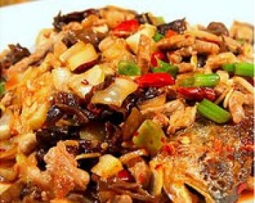 猪肉切粒用生粉与油微腌大约20分钟,泡椒,干辣椒,木耳,洋葱与葱全部切粒备用.黄花鱼清洗干净,用盐和料酒腌15分钟,然后再次冲洗干净,热油锅,把鱼放入煎至两面金黄,盛起备用. 利用锅里煎过鱼的余油先把姜,蒜爆香,放入2大匙豆瓣酱,泡椒与干辣椒煸出香辣味后,放猪肉,木耳与洋葱再炒香在鍋边倒入料酒再炒匀,倒入一点水,放入生抽和糖与味精(或鸡精可有可无) 把汁烧开把鱼放入转中小火烧3分钟,然后翻面继续再烧3分钟撒上葱花微拌, 再转大火烧至酱汁有点浓稠即可上盘