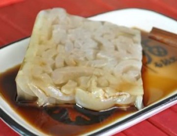 2)处理好的猪皮400克切成条或是丁,加水1100克一起放入容器里,高压锅放水放入盛猪皮和水的容器去蒸,压阀后改小火45分钟即可。等高压锅撒气 后,用罩滤将肉皮捞出。倒入保鲜盒中,加入适量的汤,加入盐和鸡精以及白椒粉调味。