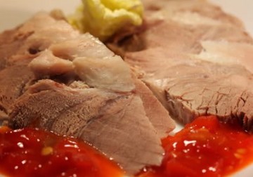 3,待肘子温度可以用手碰的时候,把肘子从锅里拿出,将骨头撤去,把肘子卷起,皮在外,放在一个朔料袋里, 将朔料袋里的肘子包紧,用绳子捆紧,放置在冰箱里,待肘子凉透了,可以随时拿出切片上盘。