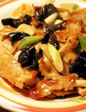 2、锅内注油烧热,下入肉片,两面煎黄,烹料酒,再下入豆瓣酱、葱姜蒜片炒香上色,加入木耳、笋,烹入味汁,翻匀装盘即成。