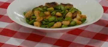 (5)锅中留底油,放入梅花菇、鲜豆瓣和鸡胸肉;