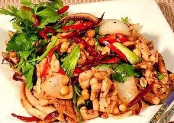 鱿鱼,花椒,洋葱,蒜头,葱段,鲜辣椒,干辣椒,芹菜,花生,老干妈,香辣酱,生粉,盐,糖,味精