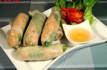 2、越南米薄饼拈湿温水变软(千万不要湿太多水,以防糊烂,可以包为佳),放一点生菜、薄荷叶、九层塔,放一点碎米粉拌的猪皮肉丝,包裹成春卷的长形状即成。吃时沾鱼露。