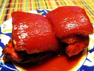 猪五花肋肉650克、葱、蒜各10克,红糟30克、虾油125克、白糖25克,酱油、绍酒各15克,五香粉0.5克,花生油25克。