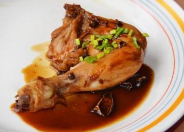 3.炒锅倒入适量油,烧热后,下入腌制好的鸡腿,略煎一会,然后放入两勺排骨酱,倒入适量清水,放入葱段和姜片以及香菇,大火烧开后转小火顿至鸡肉软烂,收干汤汁就可以了。