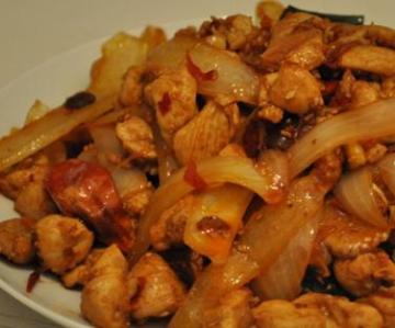 花椒,鸡丁,葱,姜,红辣椒,豆瓣酱,洋葱,蒜,少许酱油,料酒,芝麻