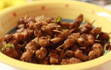 2.锅内倒油,九成热时,下入腌好的鸡肉串爆炸至鸡肉变色立即用漏勺捞出,等锅内油温再上去时,重新倒下炸,感觉油温不高时,再捞出,待油温上去时,最后放入炸一次(这样做的目的是保证肉串外焦里嫩)。