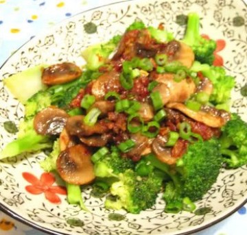三、倒入焯过的蘑菇片,更大火,加少许糖、生抽(不要放过多,因为剁椒本身较咸)、喷或沿锅边加料酒(高度酒更香),快速翻炒,再加少许水淀粉,兜匀,铺在西兰花上面,再撒上葱叶粒(此步可省,不喜欢生葱的话),可供食用。