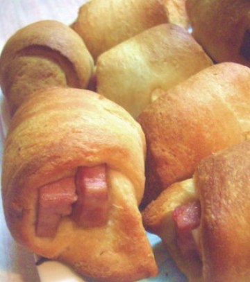 2、面片包住午餐肉条,放入预热好了的烤箱,350--375f,13分钟左右。烤好了,闻吃起来好香,吃起来好松化,省工夫,合适懒人的我啊。