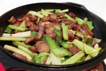 六、倒入煎过的肉和葱段,喷少许酒,翻炒几下离火即可。不要翻过长时间,因锅本身还是热的,可便食物再熟少许的。