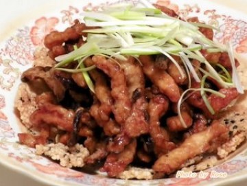 第二种:家常菜菜谱蠔油双丝盖锅巴(鸡脯肉丝冬菇丝)做法