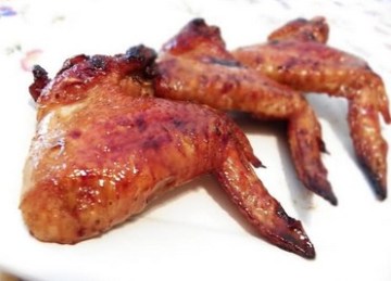 五、在取完翅膀后,在烤盘上放个网架,再将翅膀平铺上去,面朝下,底朝上,涂沫一层碗汁,放在烤箱里烤,用broil 功能档,300-350f,也就是用上火的意思,6-10分钟,开烤时请不要离开过长时间,用broil 功能很容易将食物烤糊,要时刻盯住,发觉过焦,应立刻取出,再调整温度;