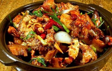 制法:莲藕切滚刀块放入热水煮大约40分钟后捞出即过冰水沥干备用.螃蟹清理后斩件撒些生粉立即入油锅炸至变色捞出控油,虾与贝扇也入油锅炸至微变色捞出控油.热油锅下蒜,姜爆香,再下豆瓣酱,花椒,干辣椒与麻辣调味入锅转小火煸大约十至十五分钟出色与香味后(我捞出花椒),再放洋葱与花生转大火翻炒,回锅莲藕,螃蟹,虾与贝扇再大火不停翻炒,料酒走边,下青葱,辣椒油,盐,糖,味精等调味炒匀撒上芹菜段再炒片刻即可出菜…