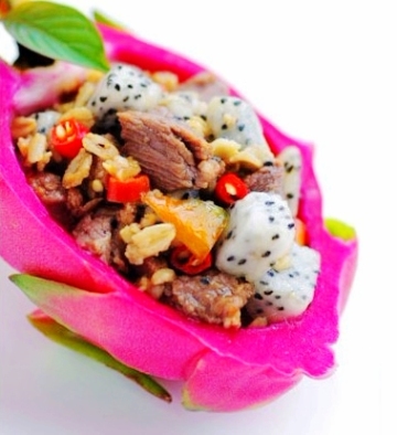 原料:牛肉200g、火龙果1个、绿皮尖椒1个、小红辣椒2个、葱1根、泡软的燕麦片少许。