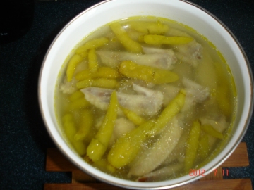 3、锅内放入老卤和适量清水,加精盐、味精、料酒、葱、姜和香料包,烧沸调好口味,放入翅尖酱约2~3分钟即可。