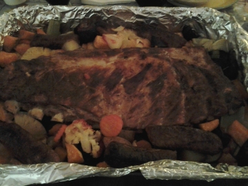 4>二小時後,加入所有蔬菜及波蘿。蓋上鍚紙,再焗二小畤。如若汁亁,再加果汁。
