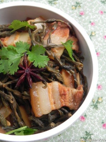 1..干菜提前用温水泡发,洗净、沥干水分待用