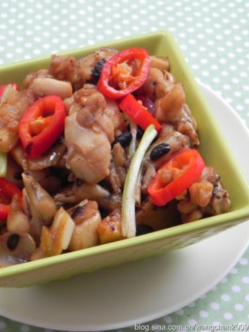 2.油爆田鸡,滑炒出锅备用,底油瀑香红葱头,姜蒜和豆豉,下田鸡翻炒,多炒一会(小潺怕寄生虫,所以还焖了一会)