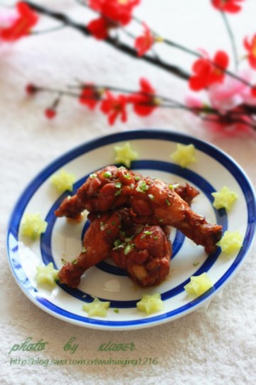 1.鸡全翅用两匙黄酒、三大匙老抽拌匀腌约半小时;