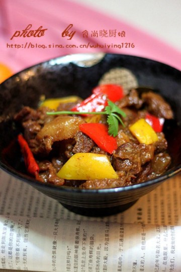 4.然后放入小红辣椒和香叶、草果、桂皮、少许花椒文火炖一个小时,一个小时以后将萝卜倒入锅中在炖半个时辰,一个半小时以后撒上盐和鸡精,将彩椒放入锅中在焖2分钟即可出锅