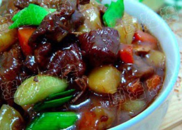 3)将羊肉放入大沙锅内加开水,料酒,酱油、盐、冰糖烧开,撇去浮沫,放入葱段、姜片、八角、桂皮、糖色,用小火炖至肉烂,再放入炸好的胡萝卜、土豆块煨透,加入味精即成。