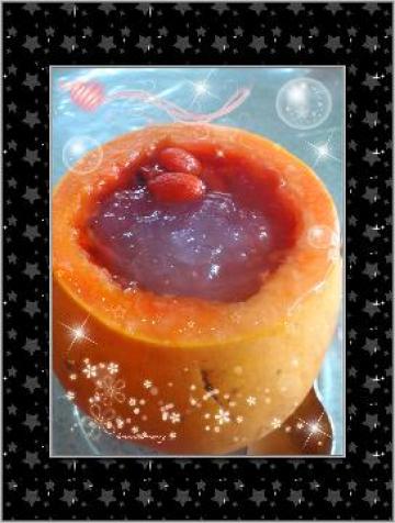 4. 把燕窝放进木瓜盅里撒上适量的枸杞,在将冰糖水趁热倒进木瓜炖盅内,加盖,隔水炖一个半小时即可。
