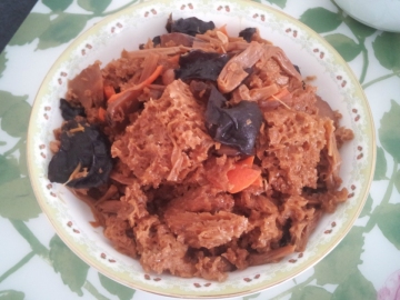 3. 爆油锅(可多些油),葱爆香,倒入以上材料,翻炒。泡香菇的水可以取其上澄清部分当做老汤加入,放酱油、盐、糖(稍多放),按照口味调出最佳状态,即可。