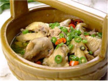 (1)鸡宰杀,煺去毛,去五脏、脚爪,洗净后,放入沸水锅中氽烫一下,捞出再度洗净。