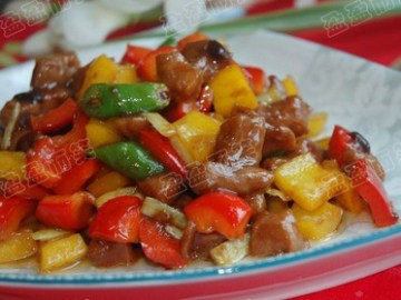 主料:黄牛肉,青指椒,黄椒,红椒,韭黄