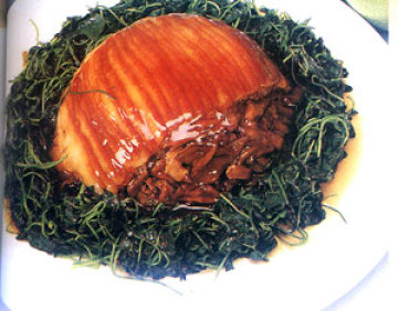 五花肉焯水,切薄片扣入碗中,腊笋切丝,炒锅上火,放入腊笋煸炒后,加调料,出锅装碗,蒸45分钟,取出扣入盆内,勾芡即成