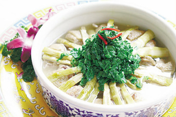 2、笋干切段放在鸭块上面,雪菜切好翻炒后放在笋干上面,另用调料,蒸至鸭熟即可。