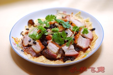 3、先将腐竹铺在碟子的最下层,再铺粉丝和云耳,然后把切好的烧肉铺在最上面,洒上少许洗净的豆豉,放糖和酱油调味,放到锅里蒸十分钟即可。