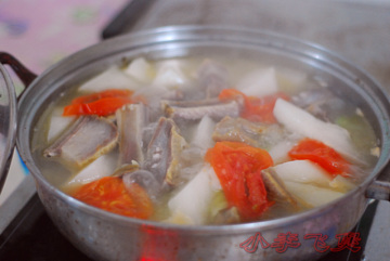 2、大豆芽菜铺在煲的最底层,第二层是大白菜,第三层是白萝卜,最后放腊排骨,加水、盐、生油,盖上盖子煮十五分钟左右,揭盖开吃!