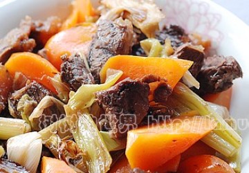 2)胡萝卜洗净去皮切滚刀块,放入牛腩里,加入生抽,老抽和糖,大火烧开后中小火煲大约45分钟左右,把火开大,糖汁略收干即可。