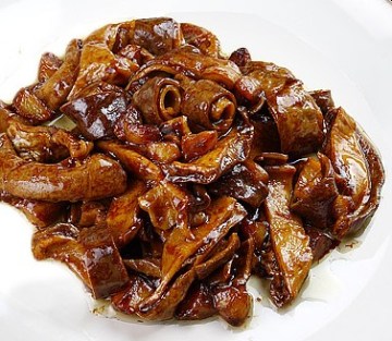 9、再烹酱油炒出酱油香味,放少许水到猪肚的一半就差不多了,然后点几滴醋,放少许胡椒粉,都是起提香去腥作用。放少许盐、白糖,不能吃出甜味,主要起厚重的作用。