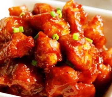 6、倒入炸好的肉丁颠勺,所有肉丁都裹满浓汁即可出锅。