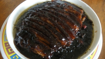 8. 蒸肉。我用的 高压锅,等上了大气后该为中火,大概12-15分钟关火。注意一定要等高压锅自动开阀门哟,因为,其实关火以后,锅里的压力还是在继续煮食物。如果要强行冲水开盖,那么就需要多蒸5分钟。开盖取出食物以后,用另外一个盘子盖在上面,然后反扣过来。美味的川味咸烧白就出炉了。(如果没有高压锅,一般蒸锅也可以,只是需要较长的时间,中火1小时到1小时30分钟)