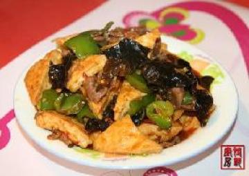 北豆腐、牛肉片、青红椒、木耳、葱、姜、蒜、豆瓣酱、酱油、白糖、鸡精、高汤、盐、黄酒、淀粉、