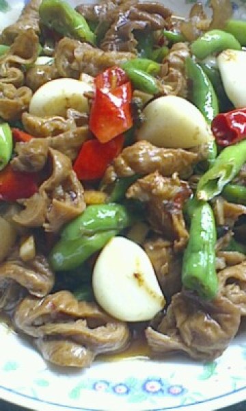 3、油锅烧热,放入蒜、豆瓣、花椒炒香,放肥肠炒加料酒少许老抽,加水焖粑。最后放青红椒,不能盖盖子,盖了,海椒会黄,再焖2分钟加味精即可,装盘。