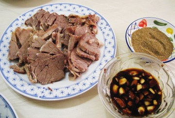 3、将炖好的牛肉捞出切片装盘,盛一小碗宴会酱油里面放葱姜碎、麻油,再盛一小碟孜然粉,牛肉蘸着吃很香哦,炖牛肉的汤不要倒掉,可以用来下面条或者做别的汤菜。