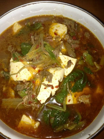 大豆腐(半块);小白菜(一把);狗肉酱(小半碗);狗肉丝(小半碗);大葱(半根)