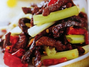 (2)油烧热,牛肉丝下锅炒散,加盐姜丝继续煸炒,在牛肉水分将干,成深红色时加豆瓣酱炒香,肉丝煸酥时加酱油,香菜,芹菜炒熟,撒上花椒即可。