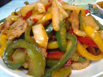 猪頸肉1块切片,指天椒5个,三色椒切丝(红,黄,绿西椒),姜1块切丝,蒜头拍拍切粒