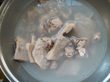 3、另烧一开水将排骨放入去血水。