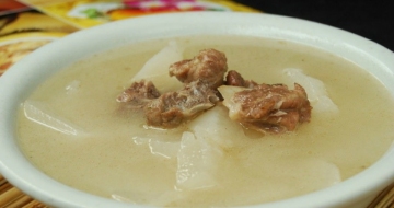 2、猪排入锅,加适量清水,滴料酒(黄酒要多,去肉腥),水开改文火,炖至肉可脱骨,再入白萝卜、葱炖熟。